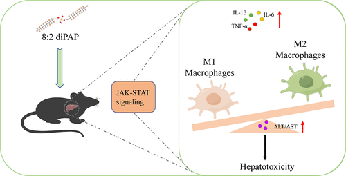PAPs 在环境介质(如水体、沉积物、灰尘)和人体样品(血液、母乳、尿液)中普遍存在,其中 8:2 二磷酸酯(8:2 diPAP)是检测频率最高的种类之一,具有环境持久性和肝脏富集性。既往研究表明 8:2 diPAP 可引起内分泌干扰、氧化损伤和生殖毒性,但其在哺乳动物中的肝毒性作用及免疫学机制尚不清楚;巨噬细胞极化(M1/M2)在肝脏炎症与疾病进展中扮演重要角色,但尚无研究系统探讨 8:2 diPAP 是否通过该机制诱导肝损伤。