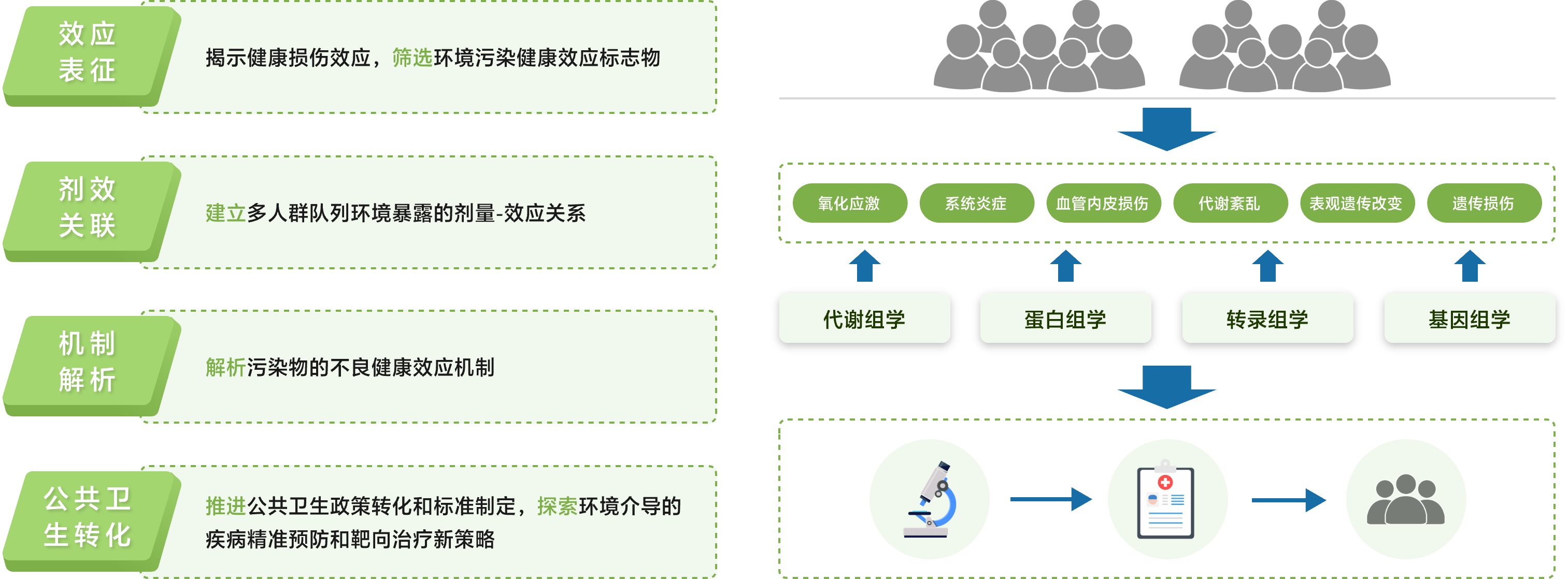 环境健康生物学机制与归因:采用体外实验、动物模型与人群队列,并整合转录组、蛋白质组和代谢组分析,探究污染物对人体健康影响的生物学机制,尤其是新污染物诱发的氧化应激、炎症、免疫失衡及其对基因表达和蛋白质功能的影响(包括潜在的表观遗传变化),开发相应生物标志物。通过环境流行病学研究,评估污染物暴露量与特定健康结果之间的关联,使用统计方法排除混杂因素精准描绘剂量-反应曲线,建立暴露剂量-效应关联,界定污染物的安全值,为环境标准和法规制定提供科学依据。